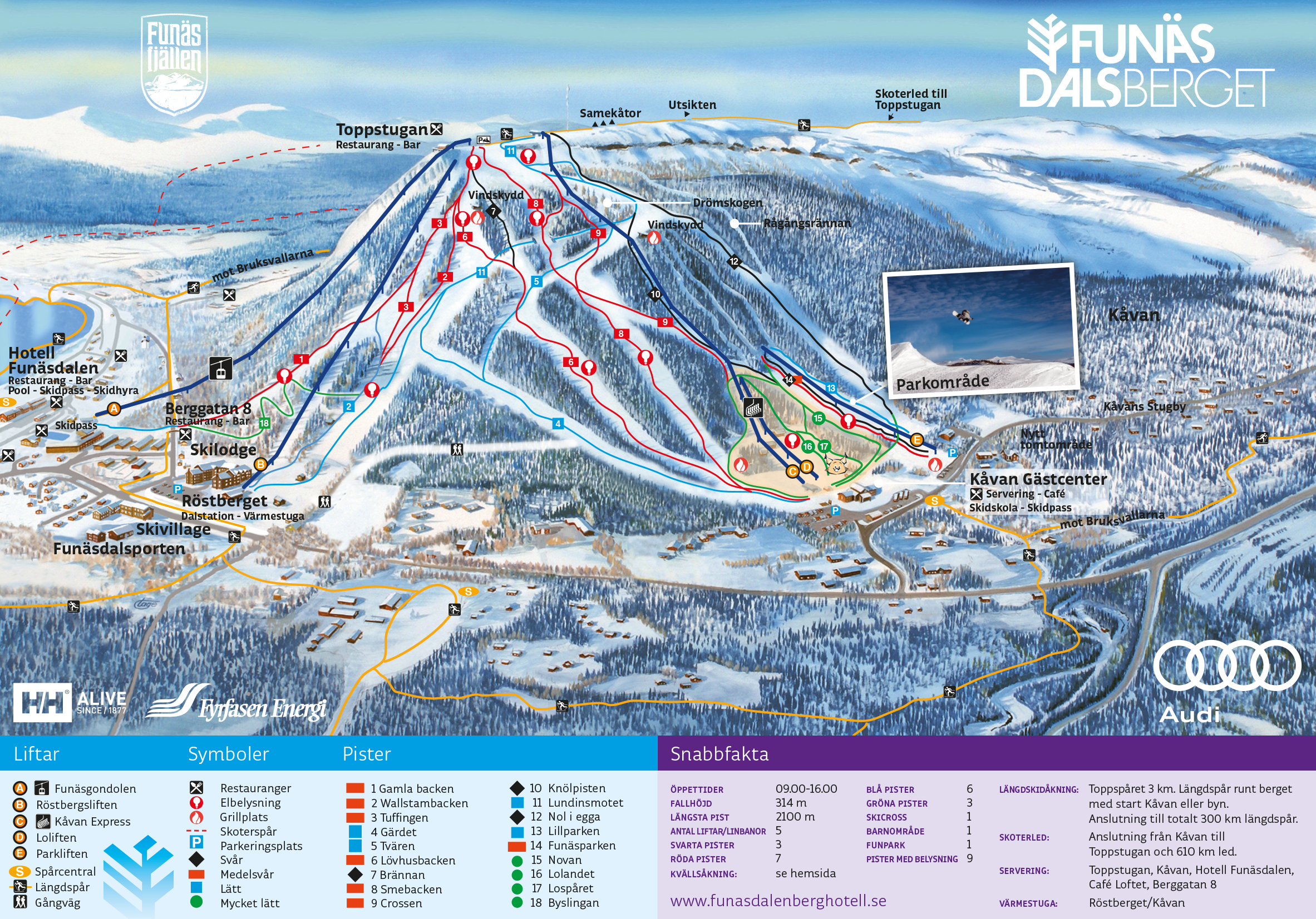 Funäsdalsberget är en del av Funäsfjällen, som flera gånger utsetts till Sveriges bästa skidort. Med ett och samma liftkort får du tillgång till över 100 nedfarter fördelade på sex olika skidanläggningar.
